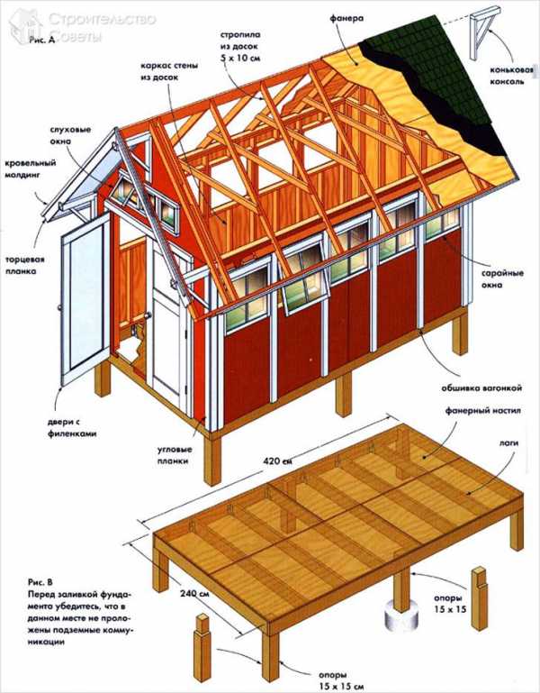 Все-таки у любого строения, в том числе сарая, оно по определению должно быть. На выбор читателя предлагается два простейших варианта. Высокая скорость монтажа и минимум расходов на сарай гарантированы.