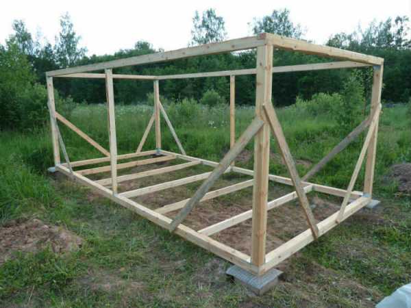 - Теперь можно установить стойки и опоры для стоек, а также балки для крыши. Основа для каркаса готова.