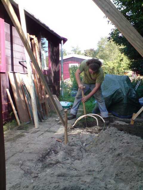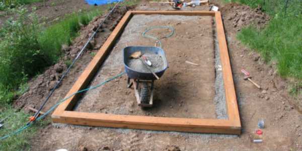 - Сначала надо снять дерн и сделать траншею по периметру будущей постройки. На дно траншеи засыпается слой гравия. Фундамент заливается бетоном.