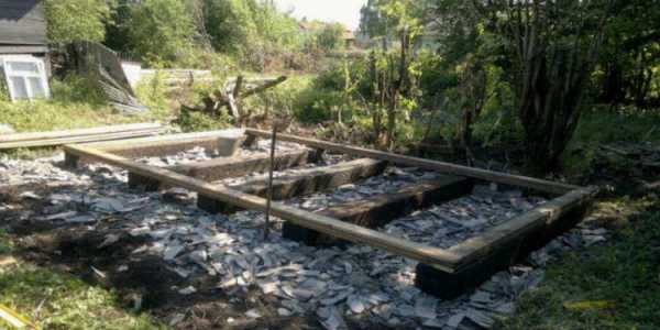 Кстати, траншеи копать и не обязательно. Нужно ориентироваться на свои возможности и местные условия. Достаточно отсыпать площадку мелкой щебенкой, хорошо уплотнить этот слой, и уже на нем укладывать опорный брус.