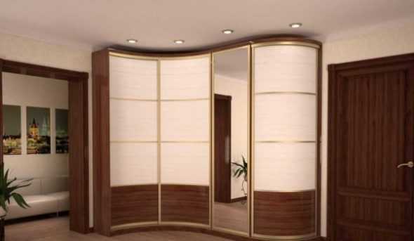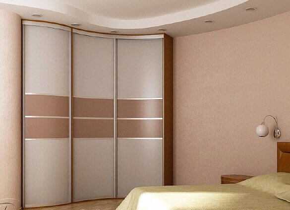 - Радиусный. Различается на внешний (с выпуклым фасадом) и внутренний с вогнутым. Также может совмещать радиусы в одном корпусе (комбинированный). Правда это редкий вариант. Чаще всего зрительную волну создают, совмещая несколько секций с разным типом радиуса. Может размещаться в самых сложных участках (возле входной двери, рядом с окном). Отлично выглядит.