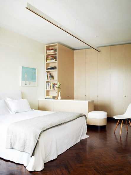 Зачастую такой способ разделения пространства используется в комнатах, где есть кладовки. Встраиваемым шкафом отгораживают кладовку, где в дальнейшем размещается спальное место или гардеробная. То есть, со стороны, кажется, что стоит шкаф, но стоит его открыть, как перед глазами открывается удивительный женский мирок с элегантно развешенными платьями и выставленными парами обуви совсем как в дорогом кино.