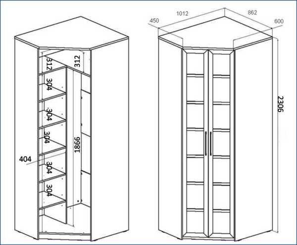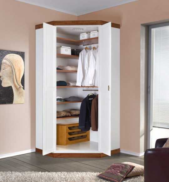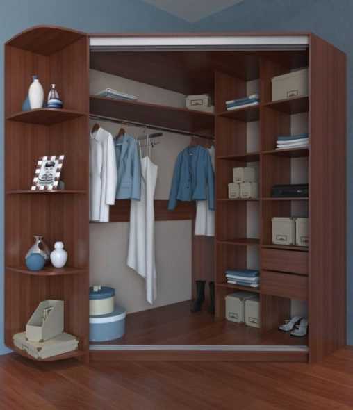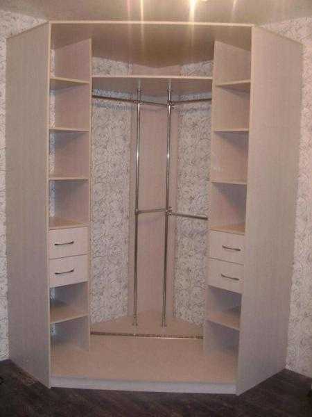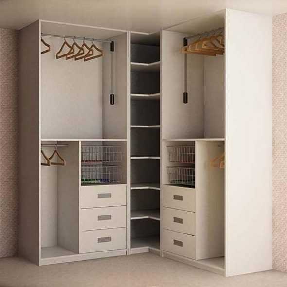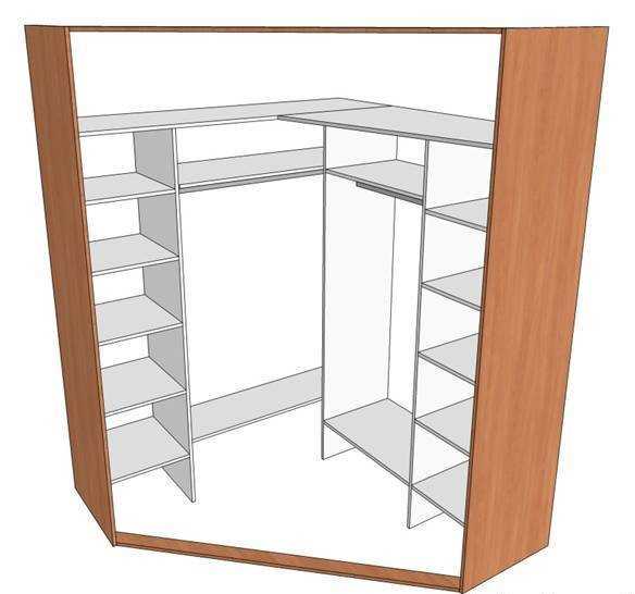 Варианты размещения полок, ящиков и штанг для одежды в угловом шкафу