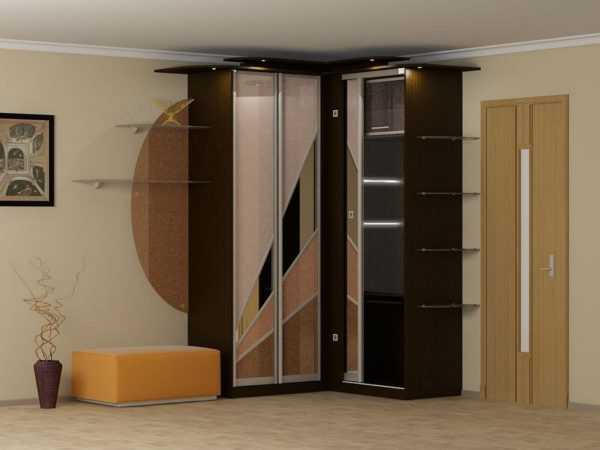 Диагональные угловые шкафы с сечением в виде треугольника удобны в небольших помещениях