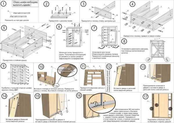 К каждому шкафу прилагается необходимая инструкция, воспользовавшись которой можно быстро и без проблем собрать шкаф. Лучше всего сборку осуществлять вдвоем, так как будет намного удобнее, когда кто-то будет придерживать полки, что приведет к предупреждению поломок.