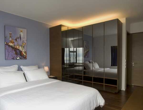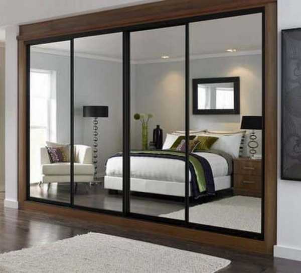 Зеркальные дверцы позволят такому огромному предмету интерьера скрыться и практически исчезнуть, увеличив при этом пространство за счет отражения в зеркале.