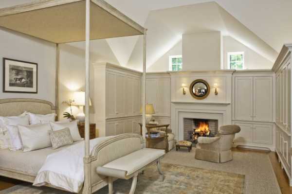 Встроенный угловой шкаф из крашеного дерева в мансардной спальне
