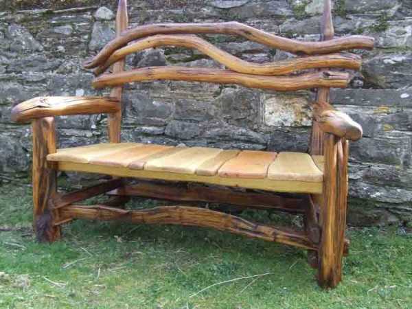 Большая степень обработки присуща следующей скамейке в том же стиле. Спинка, ножки, подлокотники сделана из толстых и не очень веток, сиденье — из ошкуренной и обработанной (очищенной от коры и отшлифованной) необрезной доски.