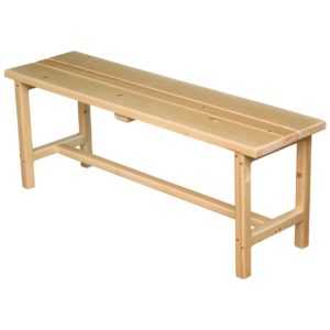 Эта скамейка без спинки имеет длину — около 120 см, ширину — около 45 см, высоту — 38 см. Скруглить грани бруса можно при помощи фрезы, а можно найти подобный профилированный. Он стоит дороже, но работать с ним будет проще: он уже хорошо обработан и соединяется просто.