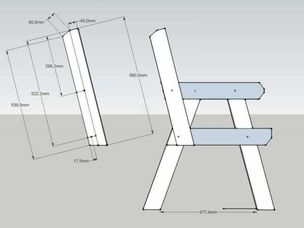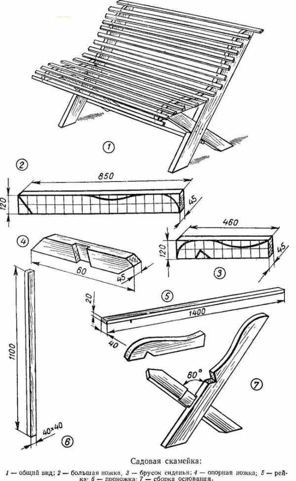 Когда будет составлен чертежный план, то по нему можно без труда определить размер каждой детали скамьи, после чего приступать к ее изготовлению.