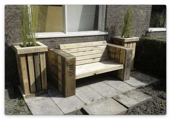 Есть примеры использования доски паллет для изготовления скамейки и других изделий из класса малых архитектурных форм. На фото сделаны еще и вазоны.
