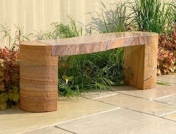 Еще один интересный вариант в стиле «этно» представлен на фото выше. Он реализован в камне, но сделать эту скамейку можно и из бревна. Сиденье — очень толстая доска, ножки — большая часть колоды большого диаметра. В колоде вырубается паз под укладку сиденья. При наличии инструмента (топором, болгаркой или бензопилой можно вырез сделать) сделать просто.