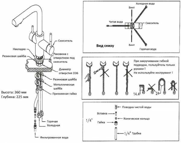 Кран вставляется в отверстие и крепится гайкой. Затем к нему подключается гибкий шланг от фильтра.