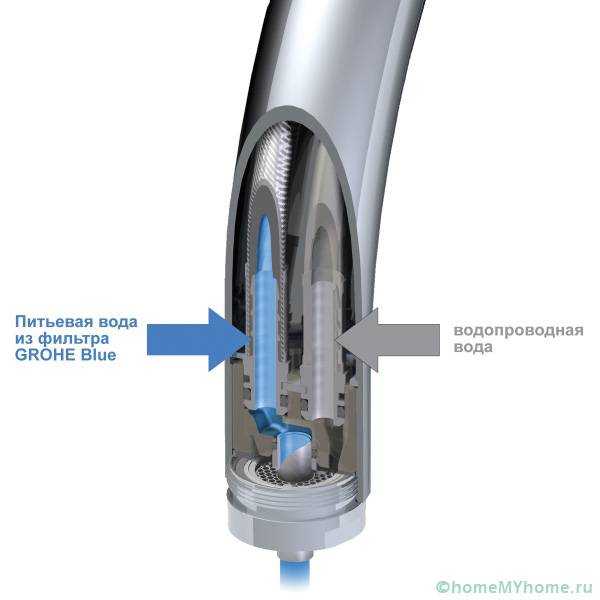Кухонный смеситель с краном для питьевой воды отличается от стандартных устройств отдельным каналом для подачи отфильтрованной воды. Отдельное отверстие для питьевой воды проделывается в общем кране. Регулирование воды выполняется при помощи специального вентиля. Питьевая и бытовая жидкости подаются по разным каналам. При этом их поступление выполняется через один излив.