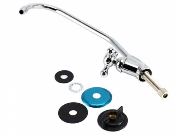 Фильтрованная вода для питья из системы очистки подается через специальный кран. Его установка производится отдельной врезкой в кухонную мойку. Для удобства применения можно выбрать более дорогостоящий вариант – комбинированный кран для бытовой и питьевой воды.