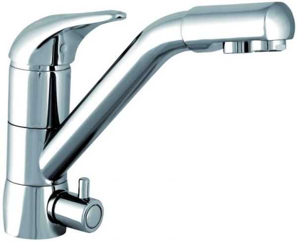 Отдельный кран для питьевой воды не всегда удобен. В некоторых случаях оптимальным решением может стать комбинированное устройство, из которого можно подавать как неочищенную, так и фильтрованную воду. От обычного смесителя оно отличается наличием дополнительного канала с отверстием на общем носике под питьевую воду, а также отдельного вентиля на корпусе. Устройство намного удобней двух отдельных кранов в общей раковине: из одного излива можно подавать воду разного качества.