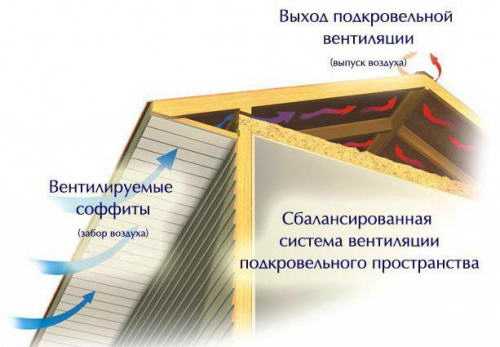 Циркуляция воздуха в мансарде происходит согласно законам конвекции, то есть более теплый воздух поднимается наверх, освобождая пространство для холодного воздуха. Без нормальной вентиляции в толще кровельного пирога скапливается конденсат, приводящий к загниванию, появлению плесени и разрушению стропильной системы. Чтобы избежать таких проблем, свес подшивают с помощью перфорированных софитов, через которые в мансарду проникает свежий атмосферный воздух, а на кровле монтируют аэраторы.