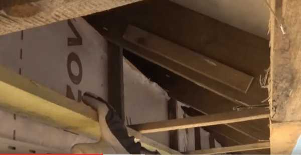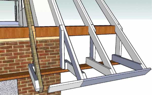 ![]() | Крепится каркас. С двух сторон нужно зафиксировать доску или брусок, и если ширина свеса более 50 см, то добавляется дополнительный элемент посередине. Для усиления через каждые 60 см ставятся перемычки, на фото они очень хорошо видны. |