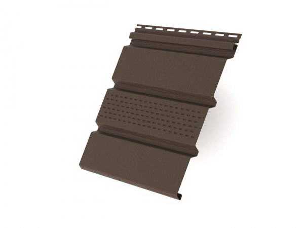 Пластиковый вид софита представляет собой панель из поливинилхлорида, оснащенный замком и перфорацией. Это самый дешевый материал, который можно найти, чтобы подшить свес. Разнообразно окрашенные модели подбирают к цвету фасадов или кровельного материала. Чтобы не нарушать целостность облика, в комплект к софитам для подшивки свеса и карниза приобретают сайдинг такого же оттенка для отделки фронтона. Наибольшей популярностью пользуется софит пластиковый коричного цвета, который гармонично сочетается с кровлей традиционных в России темных оттенков.