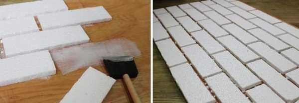 Изготовление кирпичиков происходит из разведенной до консистенции густой сметаны гипсовой смеси, которая выливается в форму, смазанную мыльным раствором. До полного затвердевания нужно ждать около двадцати минут, после чего готовый камень можно доставать из формы и окрашивать.