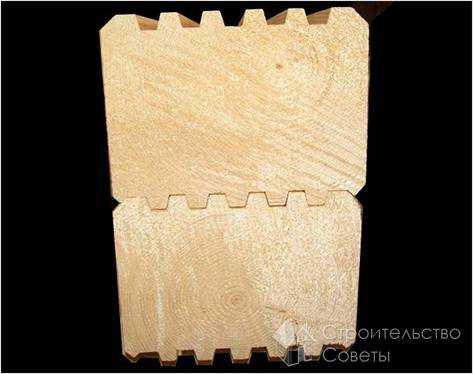 Профильный брус. Имеет собственную систему креплений «шип – паз» или волнистая «гребёнка», но такой брус лучше закупать с запасом, потому что крепления из разных партий могут не подойти друг к другу.