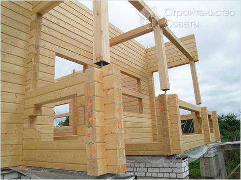 Стены необходимо собирать непосредственно на участке. По углам брус может соединяться одним из двух способов – с выступом и без него. Сначала обвязочный венец укладывается на подготовленный фундамент и соединяется в полдерева. Этот тип крепления используется независимо от выбранного соединения последующих рядов. Первый этаж должен быть высотой примерно метра три. Когда стены уложены до нужного уровня, делают перекрытие и начинают второй этаж, если таковой планируется.