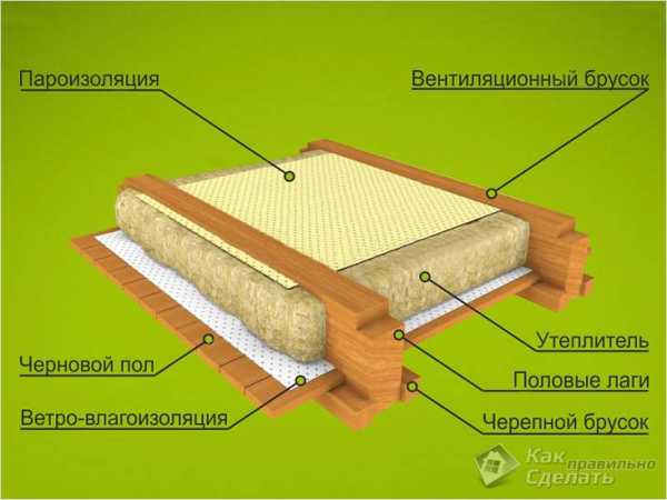 Принято этот материал подшивать снизу, но такое крепление не отличается надежностью. Для повышения характеристик здания используется черепной брус, который необходимо прикреплять к лагам.