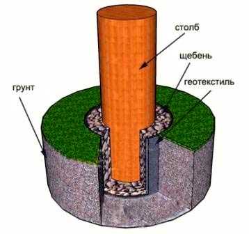 В него устанавливается столб, после чего он засыпается гравием или мелким щебнем. Гравий послойно трамбуется, благодаря чему конструкция приобретает достаточную устойчивость.