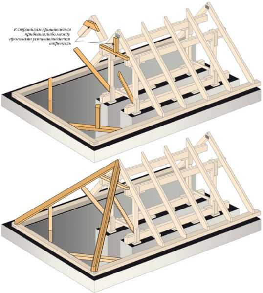 - дополнительной опорой диагональным стропилам служат шпренгели;