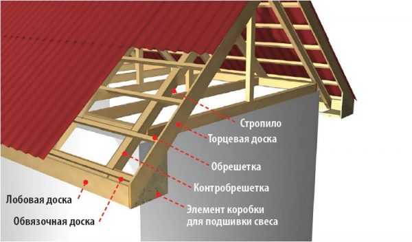 Длину обрешётки, соединяющей стропильные ноги, определяют, учитывая фронтонные свесы, которые защищают стены фасада от осадков. Длина фронтонного свеса зависит от высоты здания и выбирается в пределах от 40 до 60 см. Поэтому общая длина ската будет равна длине дома, увеличенной на удвоенную длину свеса.