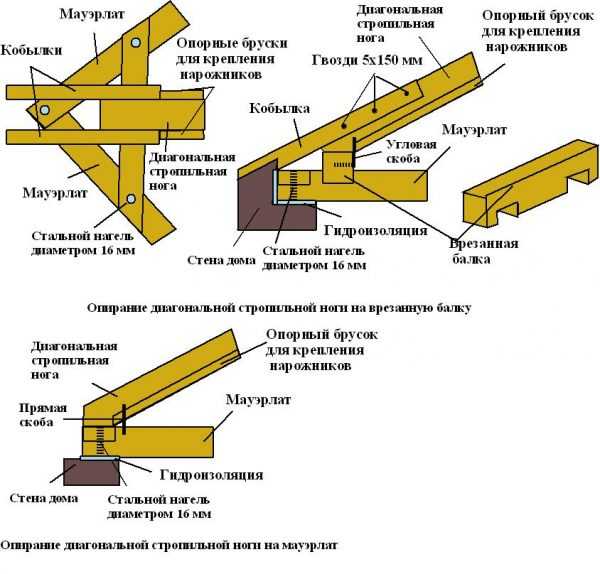 Угловые стропила вальмовой крыши несут на себе наибольшую нагрузку, поэтому узел их соединения с мауэрлатом нужно продумывать наиболее тщательноОписанные узлы применяются наиболее часто при монтаже стропильных систем разных конструкций и позволяют осуществить монтаж несущих элементов своими силами. Для эффективной и качественной сборки необходимы чертежи и изготовление шаблонов с выверенными углами стыков и врезок.