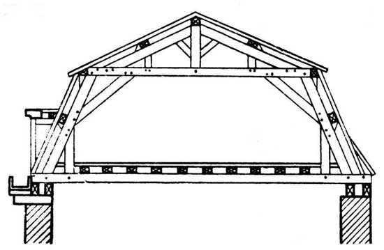 Для компенсации распирающих усилий в висячих стропильных конструкциях с длиной пролёта до 6 м используются затяжки и ригели