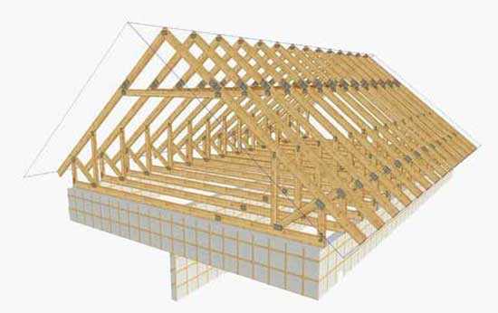 Стропила вальмовой крыши образуют два треугольных и два трапециевидных ската - Щипцовая конструкция, представляющая собой симметричную двускатную крышу с врезанными под прямым углом щипцами, что обеспечивает значительный объём чердачного помещения.