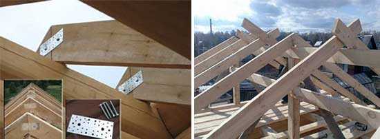 Узловые соединения стропильной системы должны выполняться так, чтобы обспечивалось максимально жёсткое крепление элементов между собойДля двускатной ломаной крыши характерным является узел, где соединяются верхняя и нижняя стропильные лаги, вертикальная стойка, ригель и прогон. Такое сложное соединение требует применения врезок, болтов, стальных пластин и строительных скоб.