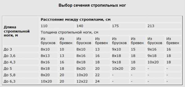 Таблица: зависимость шага между стропилами от сечения бруса и длины стропил