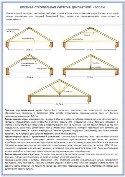 Висячая система устраивается, если расстояние между опорами-стенами не более 6,5 м, установка дополнительной опоры дает возможность перекрыть мансарду шириной до 12 метров, если требуется перекрыть более широкий участок, то на каждые 3 метра устанавливается своя опора.