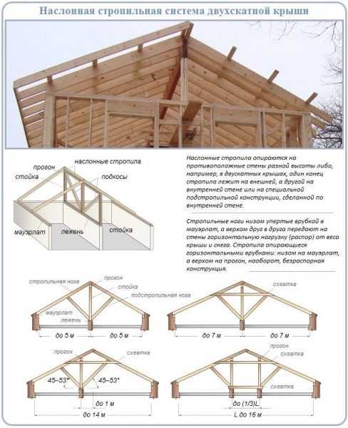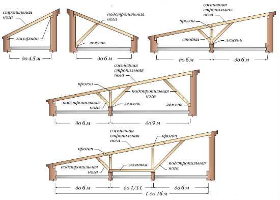 Для компенсации распирающих усилий в висячих стропильных конструкциях с длиной пролёта до 6 м используются затяжки и ригели - Наслонными именуют стропила с промежуточной опорой на внутреннюю стену дома. Они применяются, когда ширина здания составляет от 6 до 16 м. Чем она больше, тем больше элементов используется для равномерного распределения нагрузки.
