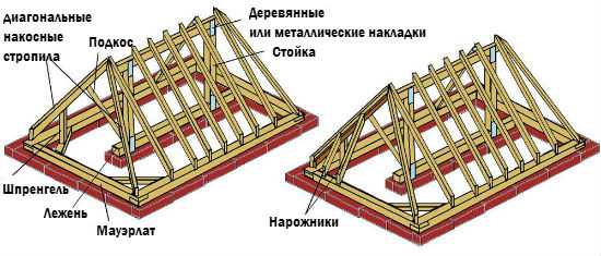 - на вальмовых крышах используются диагональные стропила и укороченные нарожники;