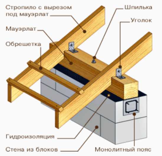- связующим элементом между стеной здания и стропильной группой является мауэрлат, который крепится на стены дома шпильками, скобами или анкерами;