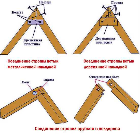 Если стропильной системой предусмотрен конек, то к коньковому брусу стропила можно крепить внахлест, либо запилив торцы под нужным углом, обязательно следует усилить стыки металлическими или деревянными накладками.