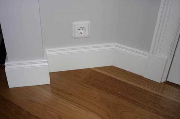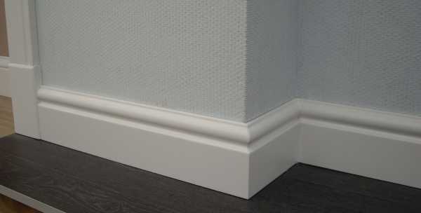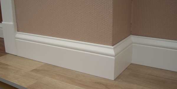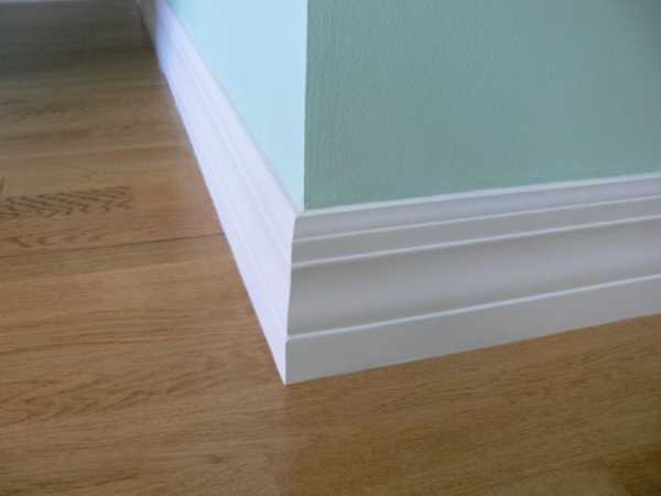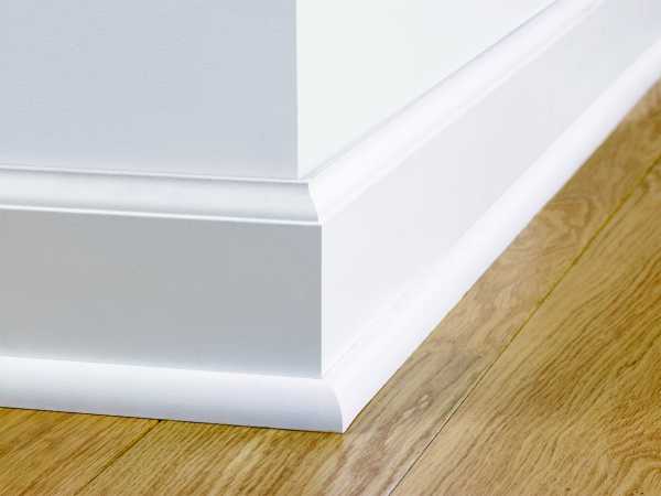 Материал белых плинтусов для пола выбирается исходя из параметров настила. Например, если пол из массива дуба, то правильным решением будет установка деревянного плинтуса.