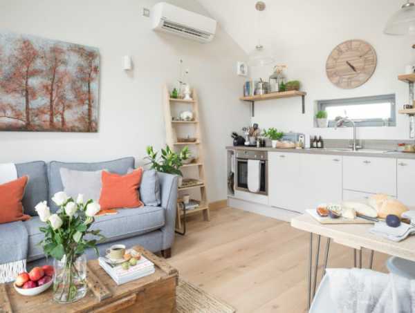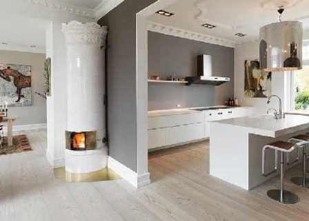 Белые галтели часто устанавливают в светлых помещениях, например в шведском стиле. Они хорошо сочетаются со светлыми оттенками пола и стен, визуально увеличивают пространство, не акцентируя внимание на четких линиях.