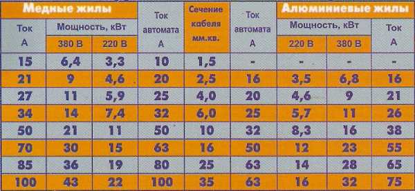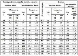 Таблица 1. Зависимость сечения кабеля от мощности электроприборов