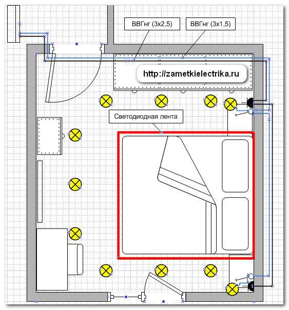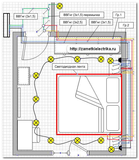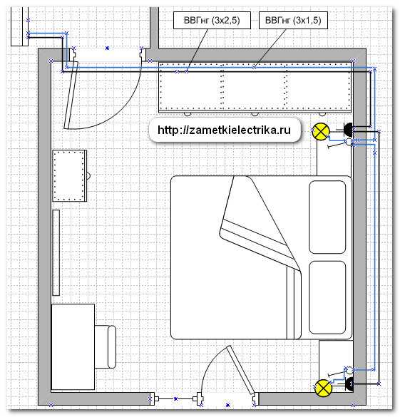 Такими же должны быть и контуры для светильников в ванной и кухне. В принципе для светильников этих двух помещений можно проложить один контур.
