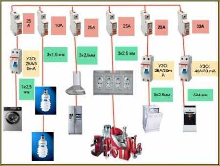 На кухне обычно используется несколько отдельных контуров. Один на освещение, один на розетки (этот контур ведется кабелем 2х2,5мм) и по одному на каждый из приборов: