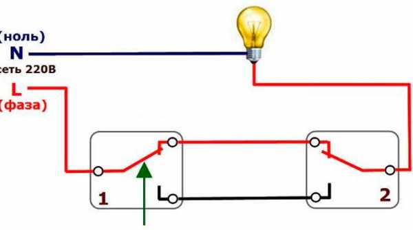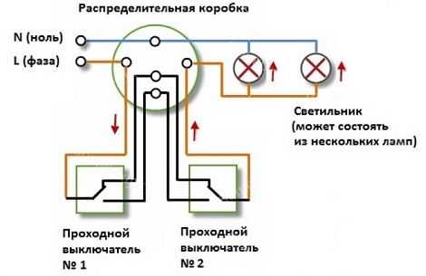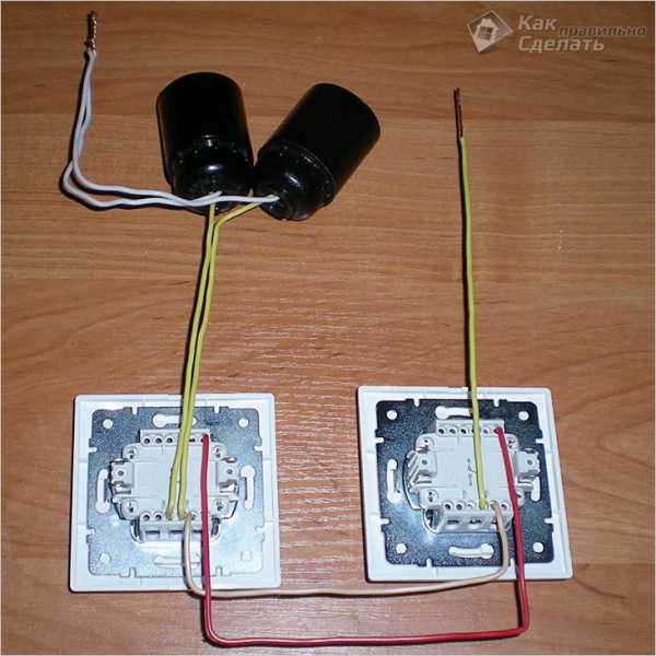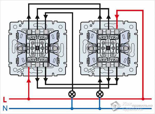 Фазный провод подается на входы обоих выключателей, а другие входы выключателей подключаются к одному из концов одной и другой лампы. Свободные концы лампы подключаются к нулевому проводнику. Два выхода одного выключателя соединяются с двумя выходами второго выключателя, а два других выхода этого выключателя подсоединяются к двум другим выходам первого выключателя.