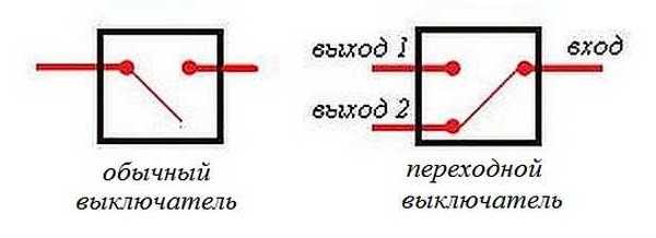 Отличия – в количестве контактовРаботает выключатель следующим образом: при переключении клавишей вход подключается к одному из выходов. Другими словами, проходной выключатель рассчитан на два рабочих состояния: