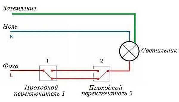 - Фаза подключается ко входу одного из проходных выключателей (с тремя входами).