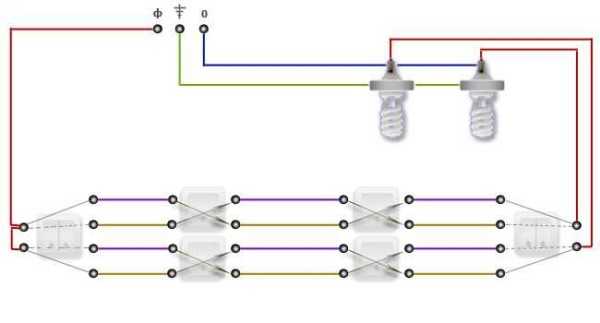 Вариант разводки проводов для подключения двухклавишных проходных выключателей.Если есть желание управлять работой двух ламп из трех или четырех точек, то придется приобрести по два перекрестных переключателя. Каждая пара выходов двухклавишного выключателя подсоединяется к одной паре одного перекрестного переключателя. И так дальше, пара за парой выходы устройств соединяются между собой.