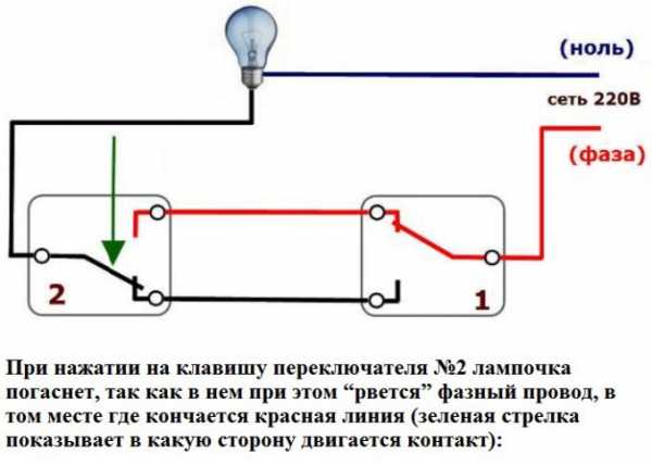 Глядя на эту схему, несложно понять, как работает проходной выключатель. В том, положении, что на рисунке, светильник включен. Нажав на клавишу любого из устройств, цепь разрываем. Точно также, при выключенном положении, переведя любой из них в другое положение мы замкнем цепь через одну из перемычек и лампа загорится.
